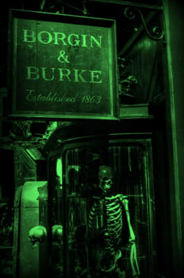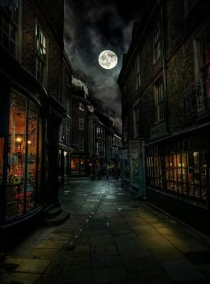 The once brightly painted shops were now dim and dreary, boasting none of the eye-catching flamboyance that inhabited Diagon Alley. Even the bricks that these businesses were constructed with were stained a dark, lifeless grey. Displayed behind dirt-stained windows were a macabre collection of oddities and artifacts; disembodied hands that were wrapped in flaky shriveled skin piled inside a large glass jar, a lacquered box with golden hinges and keyhole that seemed to quiver faintly, and the skull of an animal that you had never seen before, which appeared to have had its teeth replaced with glimmering gems.
