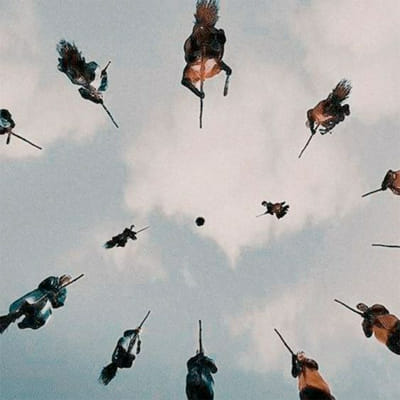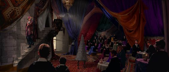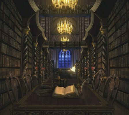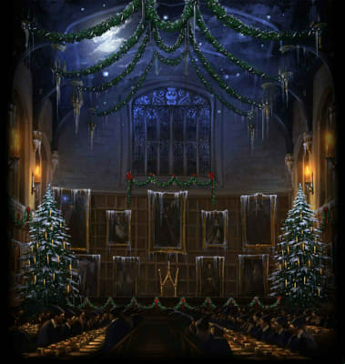 The Great Hall could have swallowed the entrance hall whole and still be left hungry; it was the largest room you had ever seen. Four wooden tables lined by identical black-clad bodies and empty dishes ran down its length. Above them, the lit wicks of the candles that lazed in the air shone like stars, and higher still was a black canvas that hovered below the stone rafters like a thin, opaque fog. You thought the image was simply another painting until you saw the penumbra of clouds shift, unleashing a mirror image of the pristine glow of the moon outside.