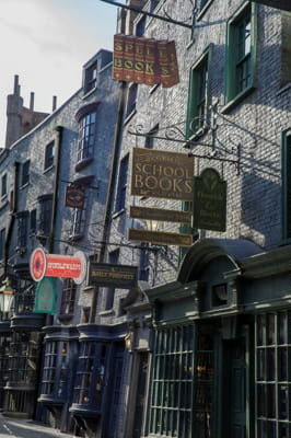 You currently found yourself strolling down a cobblestone road, your head on a constant swivel in an attempt to take in every direction and not miss a single sight. You were never left disappointed by the shops that lined the road, each one holding a new strange curiosity; Flourish and Blotts was plastered with book posters that were alive with movement; Madam Malkin's display window was graced by mannequins who dawned shimmering silken cloaks and hats as pointy as spearheads; and a stack of copper cauldrons nearly as tall as yourself sat beside the flaking magenta door of Slug and Jiggers Apothecary. All of these stores were listed on your school supplies, but Hagrid had told you that he wanted to take you somewhere special first