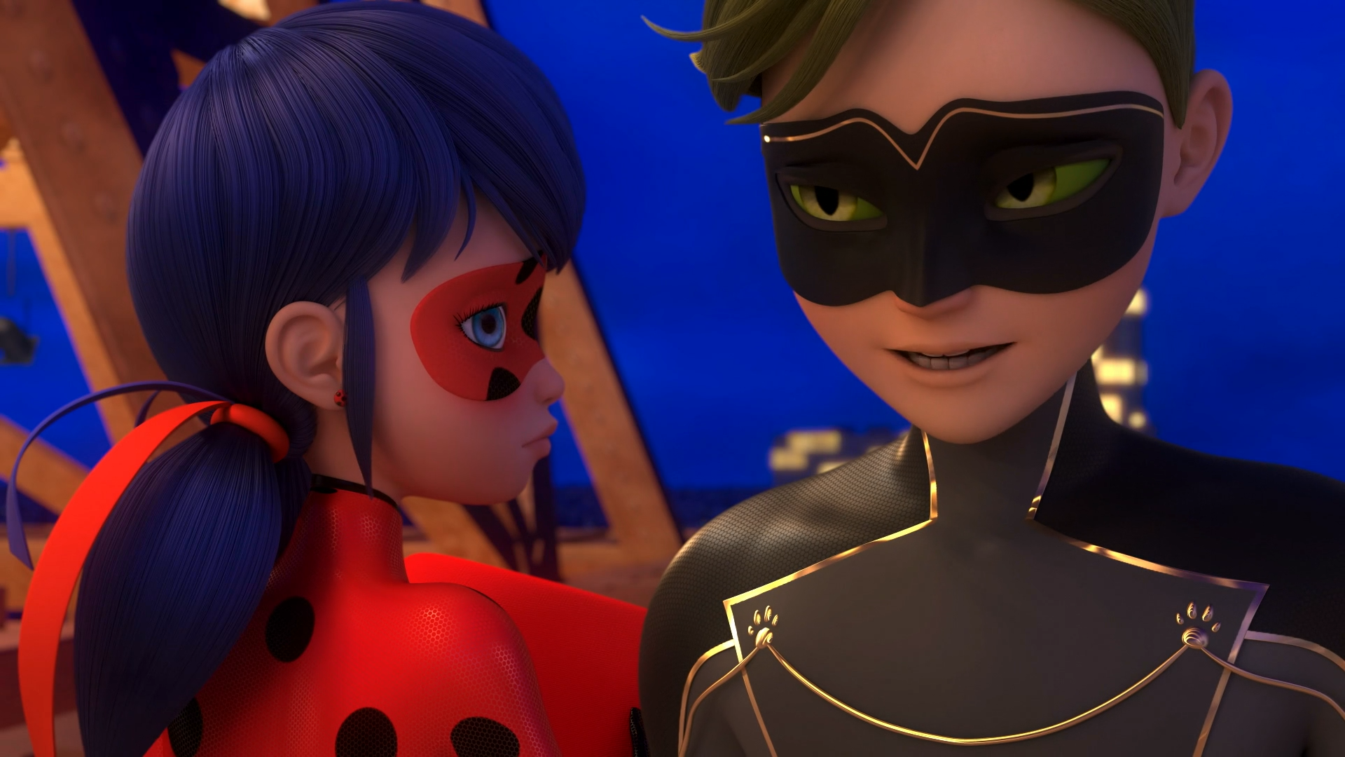 Catwalker, fist clenched around his miraculous as Ladybug looks horrified: Chat Noir’s identity…has been compromised.