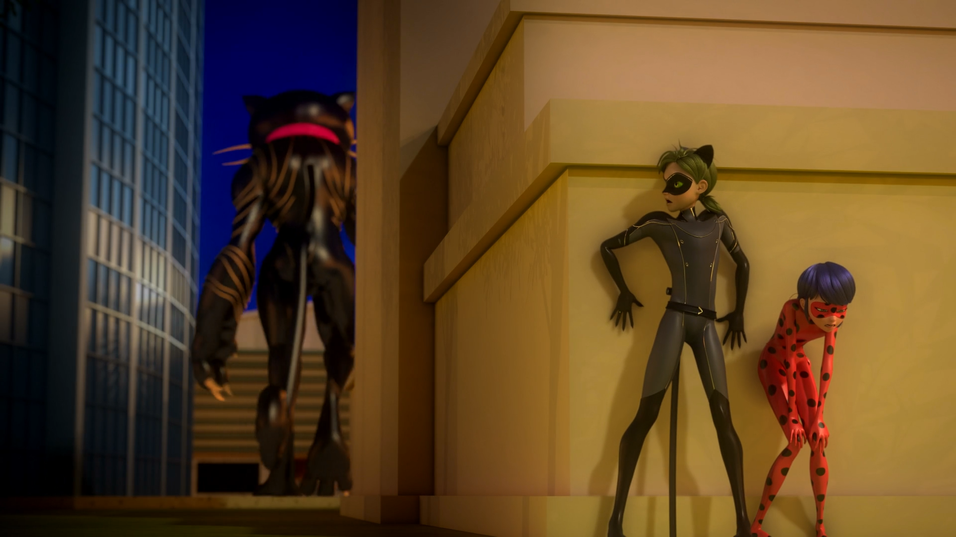 Catwalker (voiceover continues): Chat Noir was on his way to recharge his miraculous when Mayura jumped him.