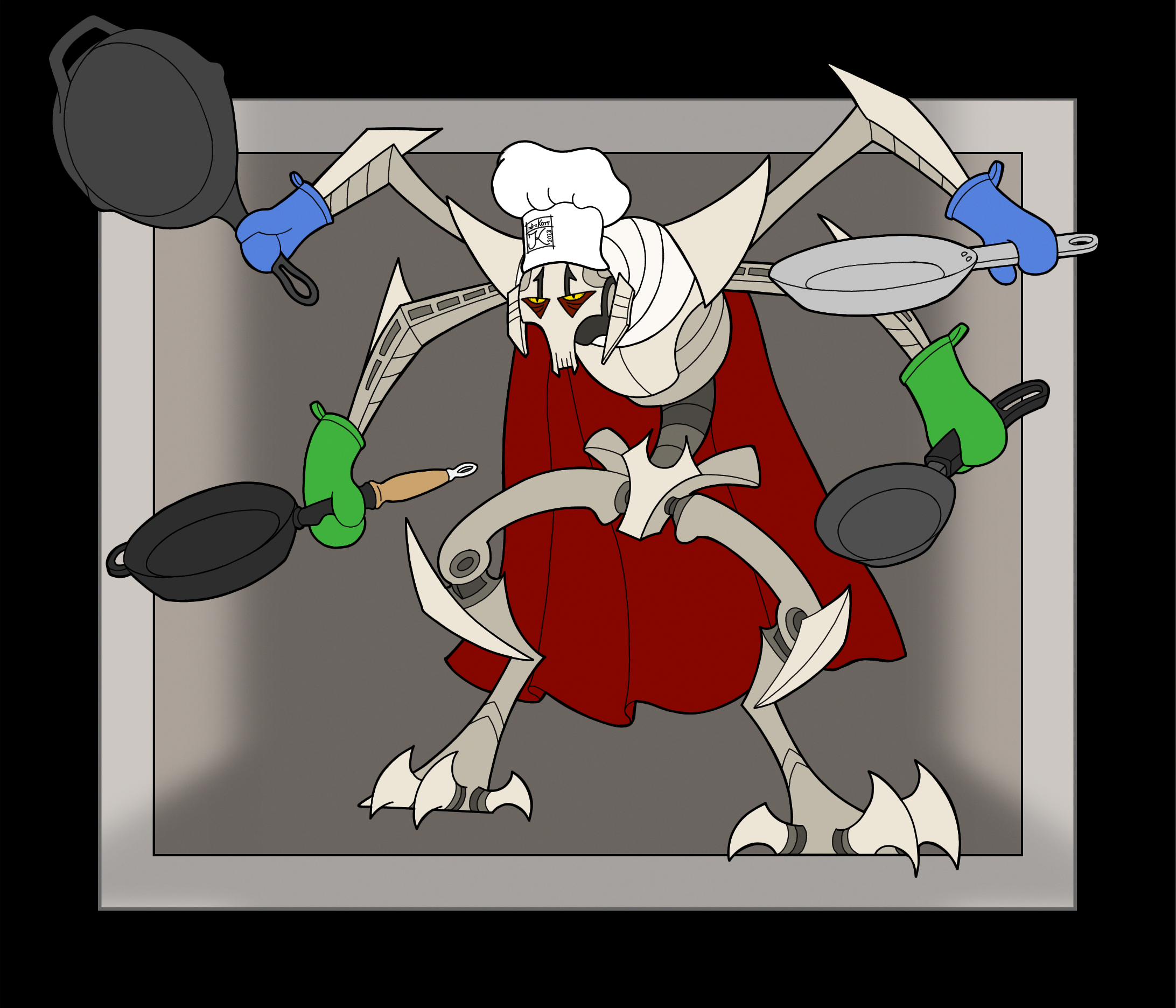 Silly fanart of 2003 Grievous wearing oven mitts, a chef's hat, and wielding frying pans.
