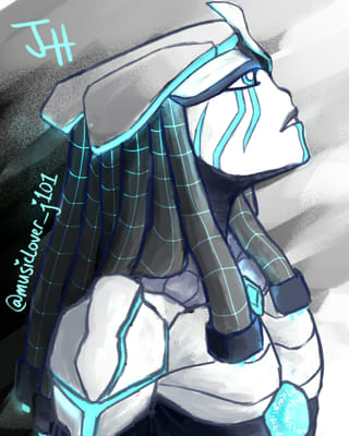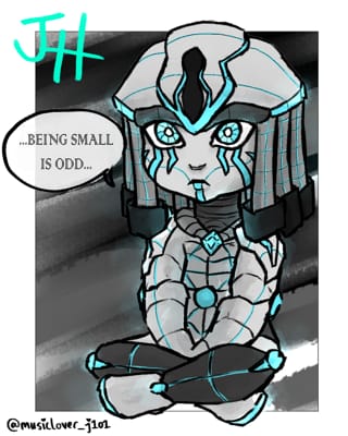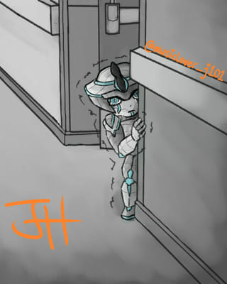 An advanced-looking robot was there. It was covered in very damaged ash-gray armor, highlighted with a neon blue that showed dimly through the infinitesimal crevasses between the plates of metal(?). It had an oddly shaped helmet on, or was that its head? There was a pitch-black visor covering most of its face, though it was just shy of its mouth. It had a mouth?