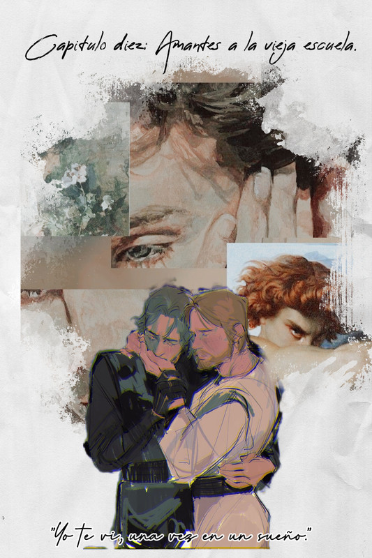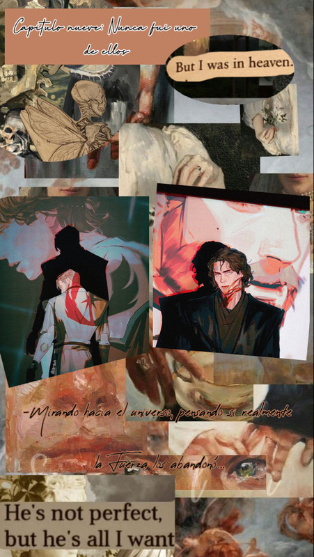 Cuando camina de manera lenta, hay sollozos que provienen del cuarto que Anakin alguna vez poseyó como propio, en una esquina, estaba el hombre que una vez conoció, sollozando, de esta forma, sus almas se mantuvieron en un coro de relajada tonalidad, Anakin lo miró, ojos azules que parecían estar irritados por las lagrimas constantes que caían por sus mejillas una y otra vez, como cuando era niño, Kenobi se acercó a él mientras las paredes de la mente del otro se arrugaban en más grietas. Anakin le miró con dolor, mientras que, Obi-Wan por el rabillo del ojo pudo verse como hace más de diez años, su cabello pelirrojo adornando su cabeza y su barba prolijamente cortada, miró al caballero que tenía en frente, este miró al suelo, arrepentido, las tonadas suaves de sus almas se mezclaron como normalmente sucedía cuando estaban juntos, el pasado entre ambos flotando como una brisa de invierno, la canción que se escuchó una y otra vez entre ambos resonó, mientras Anakin, de nuevo, se cerraba.