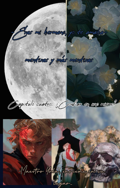 En los pasadizos interminables de esta oscuridad, se adentró hacia la boca del lobo, con las piernas entumecidas, contra esa tormenta de oscuridad, se zambulló más allá de lo que jamás pensó llegar a aguantar la oscura fuerza, con esto, una canción que alguna vez escuchó entre los archivos de la biblioteca del templo, le dio ánimos, su alma recitándola como si toda la vida la hubiera escuchado, su alma al cantar, el mismo soneto que alguna vez le cantó a Luke cuando huyendo a Tatooine este lloró por la ausencia de su gemela, separados, por miles de estrellas luego de nacer, más era la canción que alguna vez le cantó como una sonata de cuna a Anakin, quien por las pesadillas que jamás lo dejaron, pidió sus brazos como asilo, cuando más lo necesitó, él los abrió con cariño, recitándola, siempre varió entre muchas más pero, esta fue la favorita de Anakin.