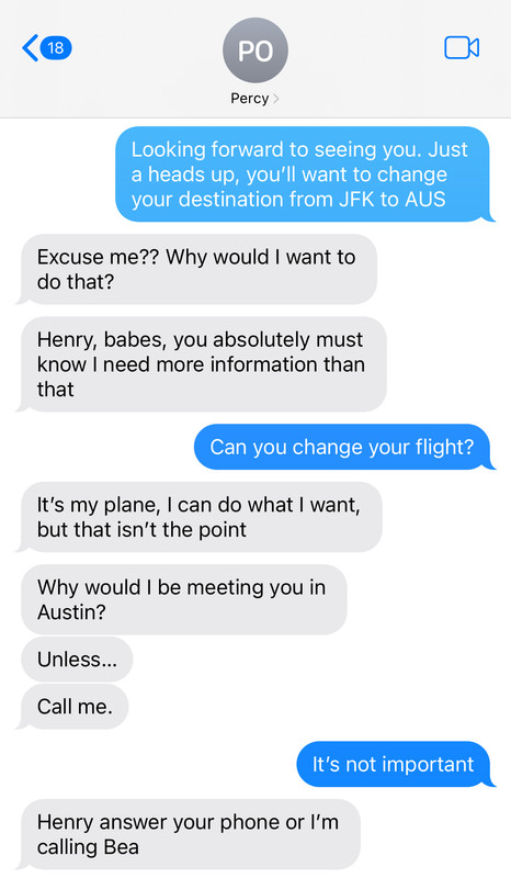 “I wasn’t born yesterday,” Pez tells him. “I distinctly remember that he and his exquisite sister spend a lot of their holidays at a lake house outside of Austin, and suddenly I’m supposed to reroute my flight - which will add two whole hours to my journey, by the way - to that very city.”