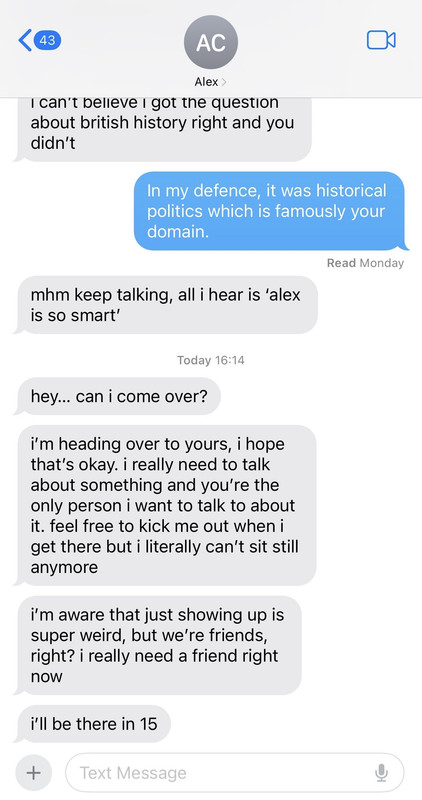 It wasn’t until Saturday afternoon that he bit the bullet and messaged his best friend.