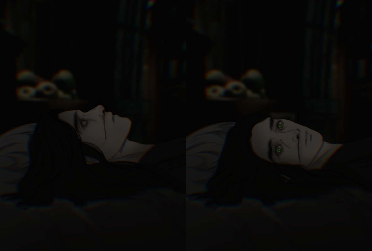The mattress sank deeper. Something brushed her cheek, and she failed to suppress a flinch — strands of hair dangling from above, thin like spider's silk. Slowly, she opened both eyes, her brows drawing together in helpless terror.