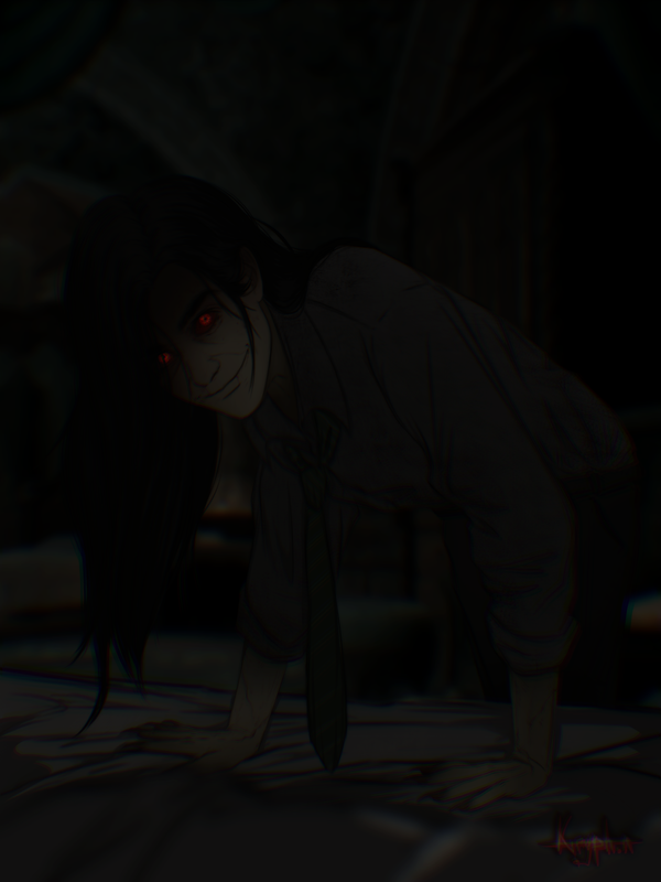 Apocrypha lowered her hands and opened her eyes to find herself back in the dormitory. It had dragged itself halfway onto her bed now, legs still hidden beneath while those long fingers clutched her blanket. Even through her tears, even through the void where its face should've been, she could see its eyes curved slightly at the bottom, suggesting a sly, knowing smile.