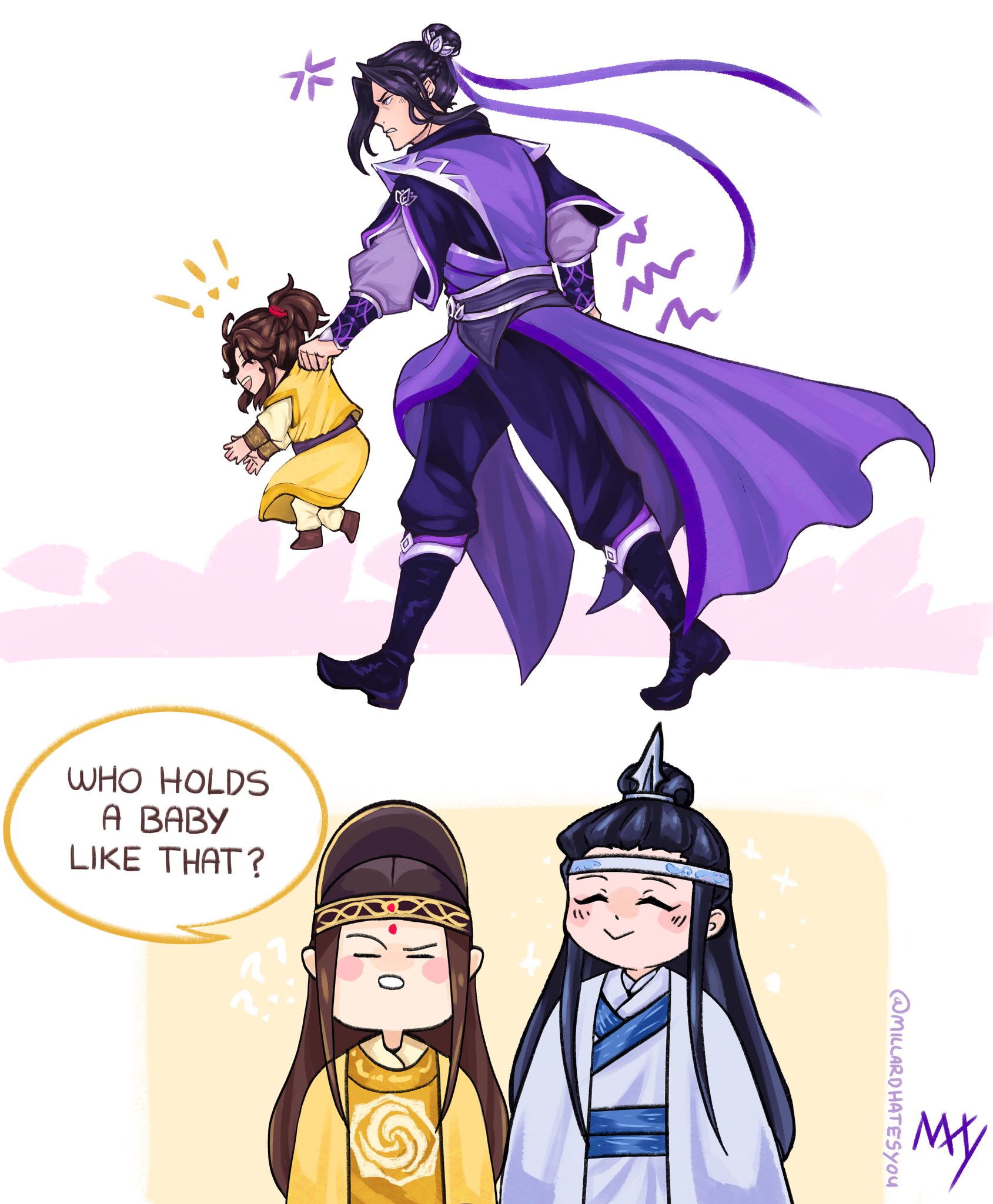 Jiang Cheng went rigid when his nephew hugged him. Lan Xichen made a weird face, like he could read Jiang Cheng’s discomfort as well as his own.