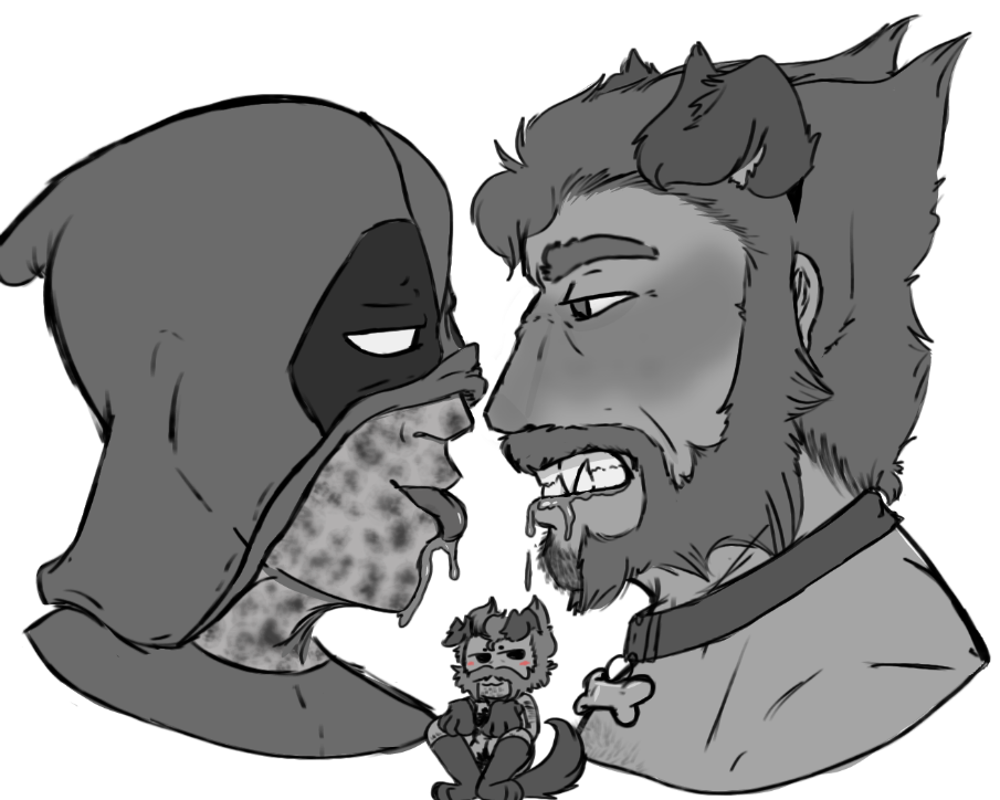 A steady grip upon the leash in one hand and his cock in the other, Wade teases the man’s entrance with his tip- a whimper flowing past Wolvie’s lips.