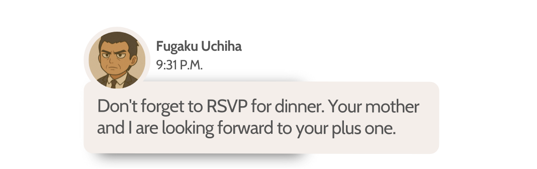 That was why it had to be him. Anyone else—a mutual friend, some polite acquaintance—and Ino would sniff out the lie before the appetizers arrived. But Sasuke? The human equivalent of a locked vault? No one would question it. They'd be too busy picking their jaws up off the floor.