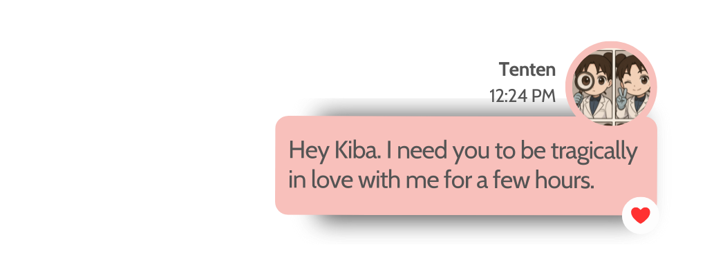 The retort should've been dry. Maybe even teasing. But this was Sasuke. Tenten had seen skeletons with more emotional range. At least bones had the decency to rattle when you shook them. Sasuke just got tighter, like a tourniquet twisting around the conversation.
