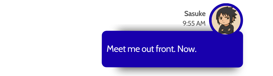 Sasuke turned to leave, and she lunged in front of him, arms spread wide open, barring his escape.