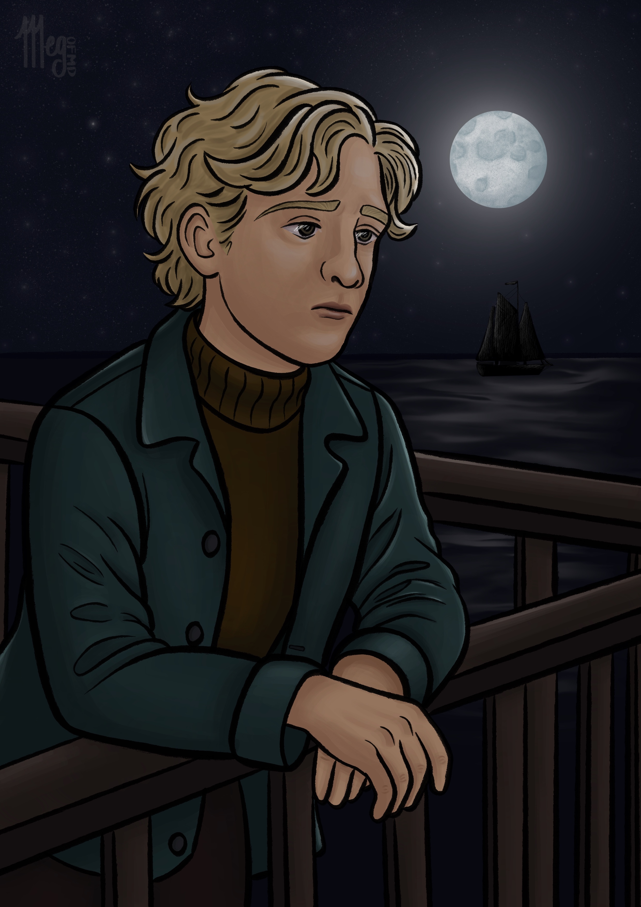 Artwork of a young Stede, leaning against the railing, looking off into the distance, out over the water. The moon is full, casting light over the water in the distance, and a sailboat can be seen on the water, silhouetted against the light from the moon. He looks sad. He’s wearing a teal jacket, a dark gold sweater, and brown trousers.