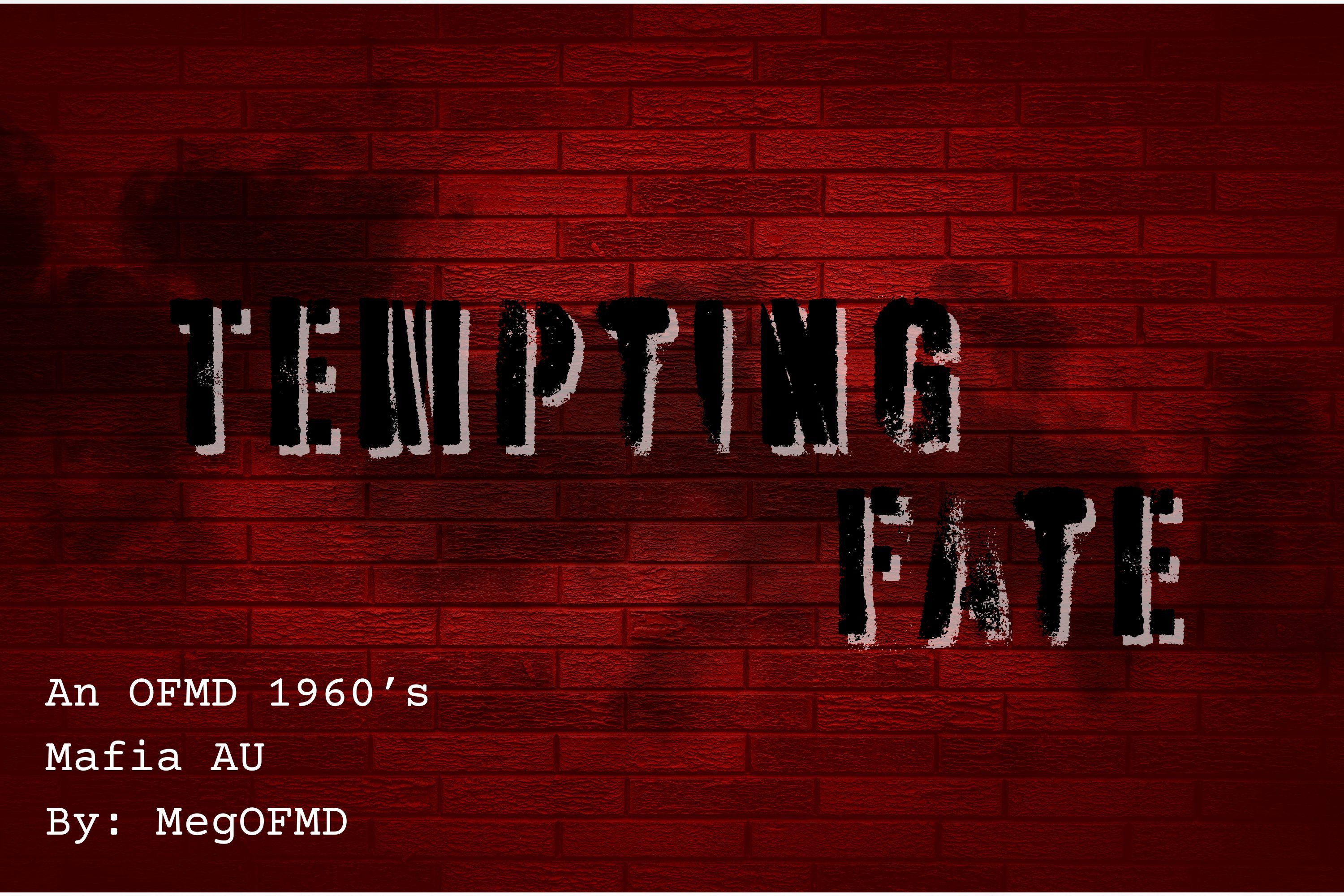 A picture of the title card for the story, “Tempting Fate.” It has a red brick background with stylistic, faded, typewriter-like font for the title, and a caption in the bottom left corner that reads, “an OFMD 1960’s mafia AU By: MegOFMD.”