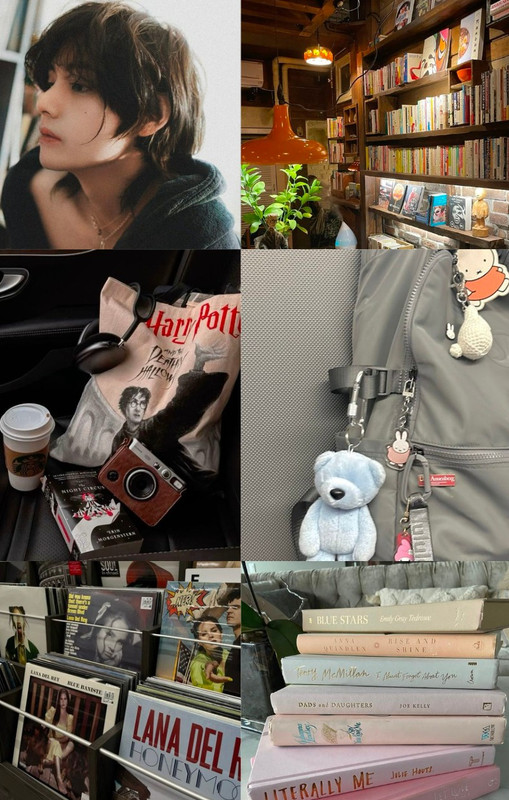Taehyung hummed a soft tune as he folded a soft, oversized sweater into his open suitcase. His room was a beautiful, cozy sanctuary that perfectly reflected its owner. Books weren't just on the shelves; they were stacked in teetering towers on the floor, bookmarked with train tickets and dried flowers. Fairy lights were draped haphazardly over the headboard of his bed, which was buried under a mountain of plushies. A large, well-loved copy of "The Little Prince" sat on his nightstand next to a pair of round, wire-rimmed glasses. The walls were a gallery of polaroids, concert posters for indie bands, and postcards from places he dreamed of visiting. It was the warm, slightly chaotic nest of a nerdy, aesthetic GenZ boy who found comfort in stories and soft things.